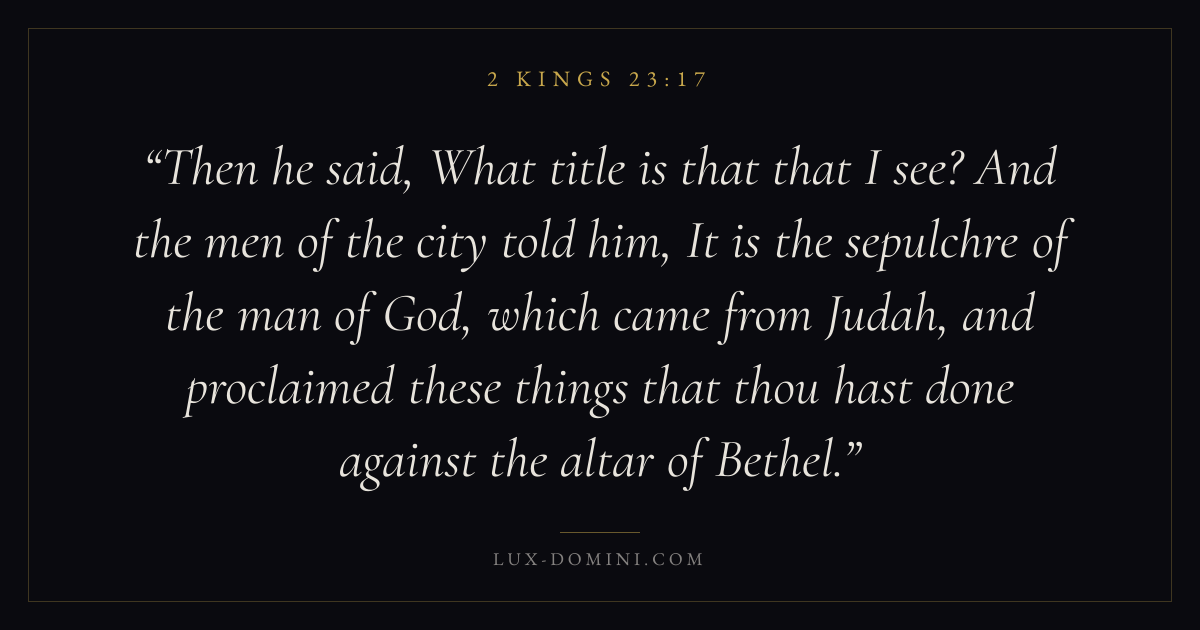 Then he said, What title is that that I see? And the men of the city told him, It is the sepulchre of the man of God, which came from Judah, and proclaimed these things that thou hast done against the altar of Bethel.