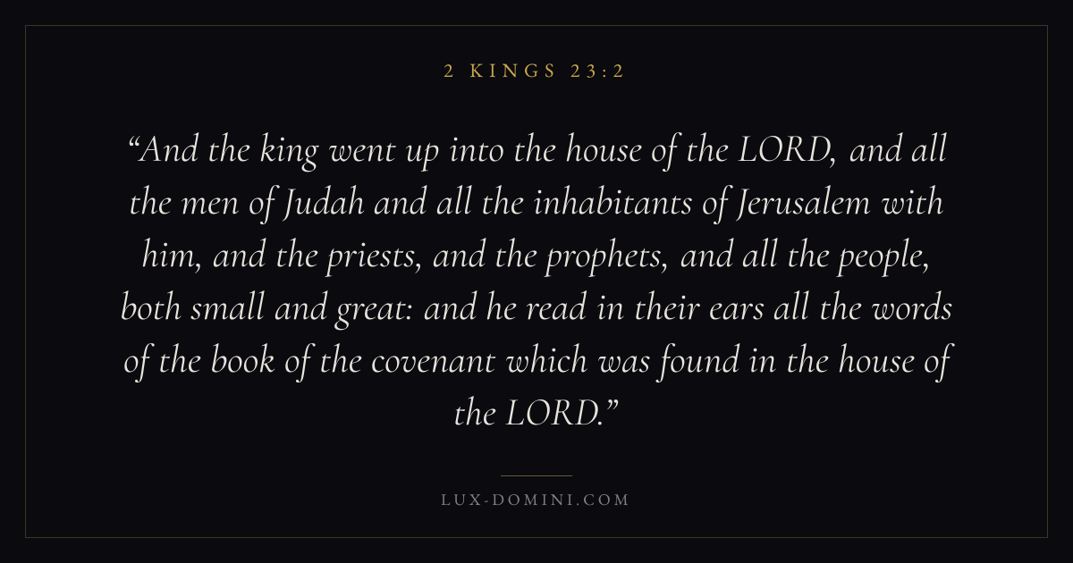 And the king went up into the house of the LORD, and all the men of Judah and all the inhabitants of Jerusalem with him, and the priests, and the prophets, and all the people, both small and great: and he read in their ears all the words of the book of the covenant which was found in the house of the LORD.
