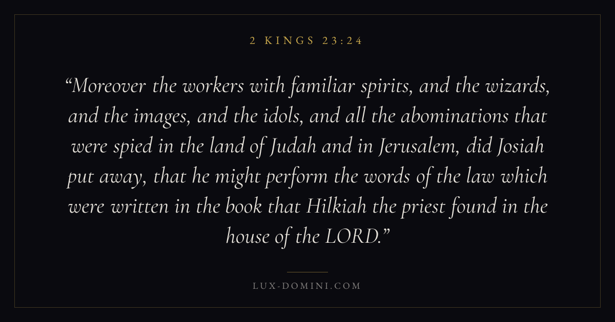 Moreover the workers with familiar spirits, and the wizards, and the images, and the idols, and all the abominations that were spied in the land of Judah and in Jerusalem, did Josiah put away, that he might perform the words of the law which were written in the book that Hilkiah the priest found in the house of the LORD.