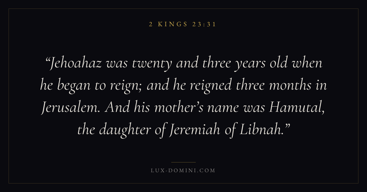 Jehoahaz was twenty and three years old when he began to reign; and he reigned three months in Jerusalem. And his mother’s name was Hamutal, the daughter of Jeremiah of Libnah.
