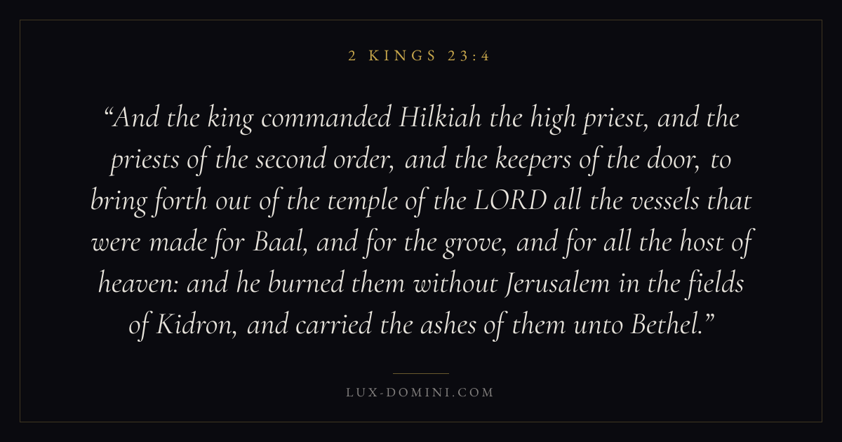 And the king commanded Hilkiah the high priest, and the priests of the second order, and the keepers of the door, to bring forth out of the temple of the LORD all the vessels that were made for Baal, and for the grove, and for all the host of heaven: and he burned them without Jerusalem in the fields of Kidron, and carried the ashes of them unto Bethel.
