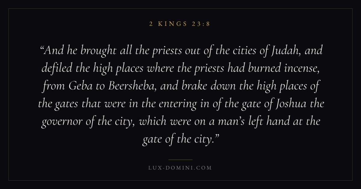 And he brought all the priests out of the cities of Judah, and defiled the high places where the priests had burned incense, from Geba to Beersheba, and brake down the high places of the gates that were in the entering in of the gate of Joshua the governor of the city, which were on a man’s left hand at the gate of the city.