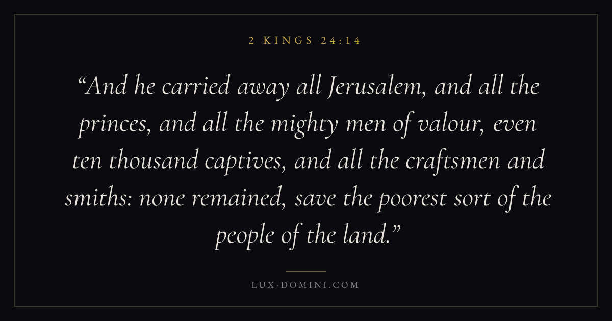 And he carried away all Jerusalem, and all the princes, and all the mighty men of valour, even ten thousand captives, and all the craftsmen and smiths: none remained, save the poorest sort of the people of the land.