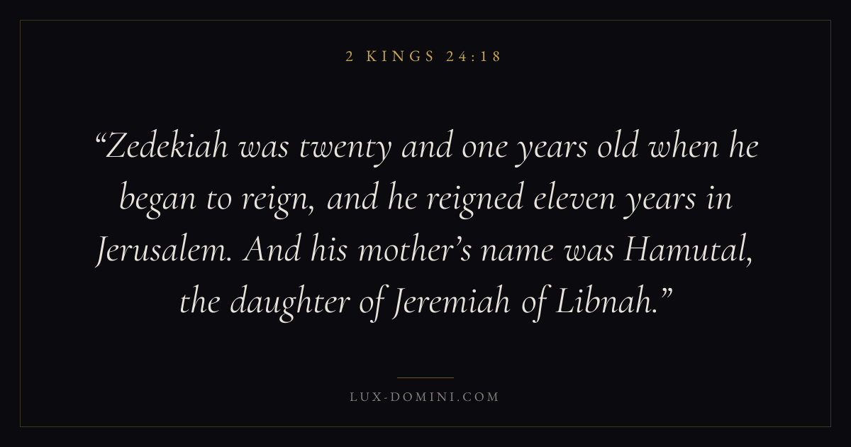 Zedekiah was twenty and one years old when he began to reign, and he reigned eleven years in Jerusalem. And his mother’s name was Hamutal, the daughter of Jeremiah of Libnah.
