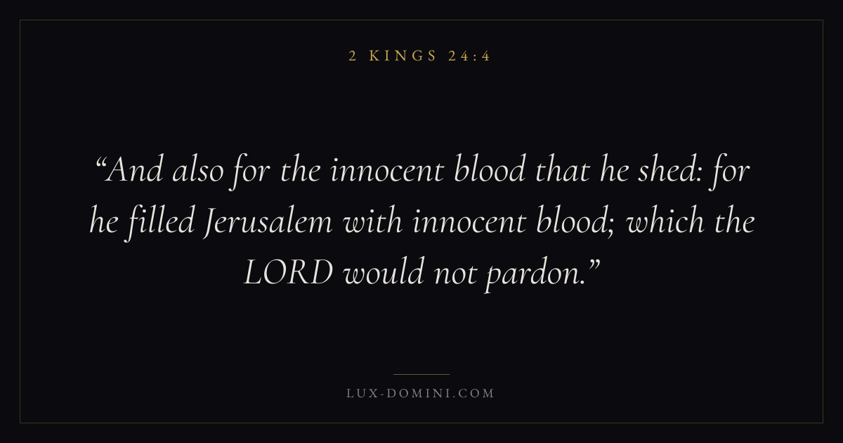 And also for the innocent blood that he shed: for he filled Jerusalem with innocent blood; which the LORD would not pardon.