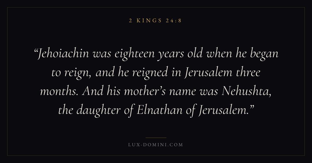 Jehoiachin was eighteen years old when he began to reign, and he reigned in Jerusalem three months. And his mother’s name was Nehushta, the daughter of Elnathan of Jerusalem.