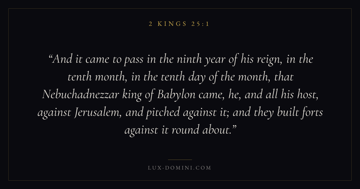 And it came to pass in the ninth year of his reign, in the tenth month, in the tenth day of the month, that Nebuchadnezzar king of Babylon came, he, and all his host, against Jerusalem, and pitched against it; and they built forts against it round about.