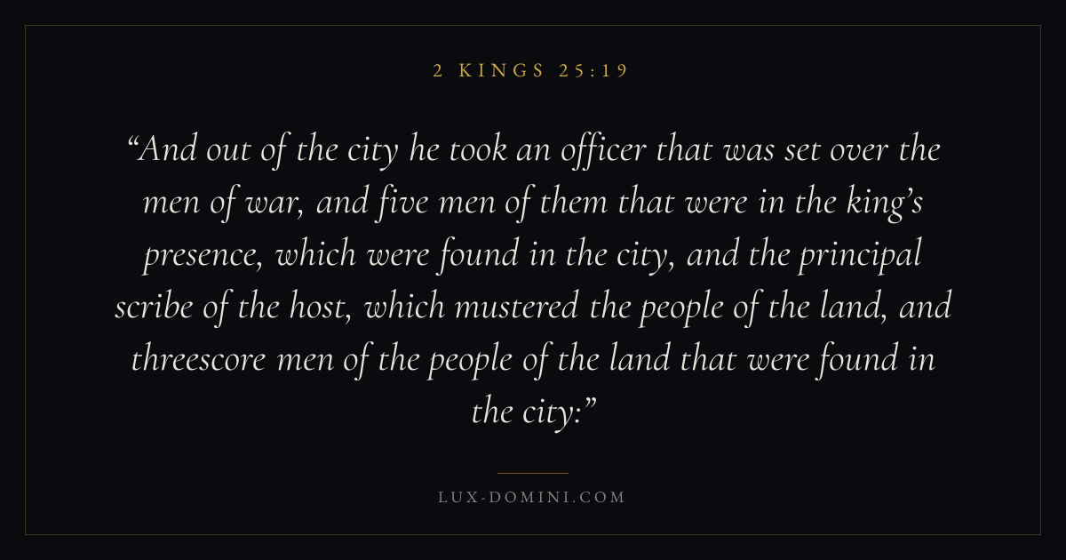 And out of the city he took an officer that was set over the men of war, and five men of them that were in the king’s presence, which were found in the city, and the principal scribe of the host, which mustered the people of the land, and threescore men of the people of the land that were found in the city: