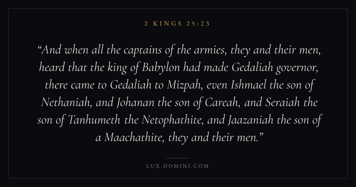 And when all the captains of the armies, they and their men, heard that the king of Babylon had made Gedaliah governor, there came to Gedaliah to Mizpah, even Ishmael the son of Nethaniah, and Johanan the son of Careah, and Seraiah the son of Tanhumeth the Netophathite, and Jaazaniah the son of a Maachathite, they and their men.