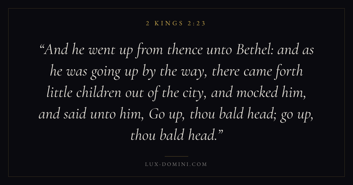 And he went up from thence unto Bethel: and as he was going up by the way, there came forth little children out of the city, and mocked him, and said unto him, Go up, thou bald head; go up, thou bald head.