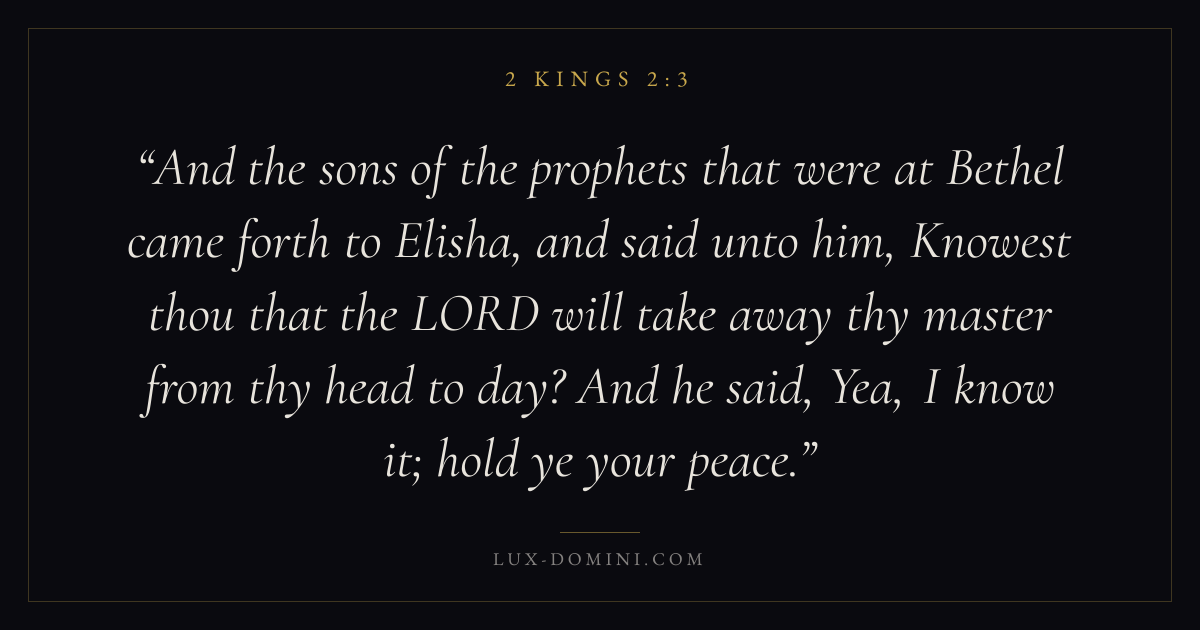 And the sons of the prophets that were at Bethel came forth to Elisha, and said unto him, Knowest thou that the LORD will take away thy master from thy head to day? And he said, Yea, I know it; hold ye your peace.