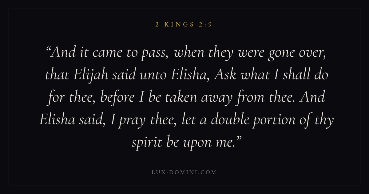 And it came to pass, when they were gone over, that Elijah said unto Elisha, Ask what I shall do for thee, before I be taken away from thee. And Elisha said, I pray thee, let a double portion of thy spirit be upon me.