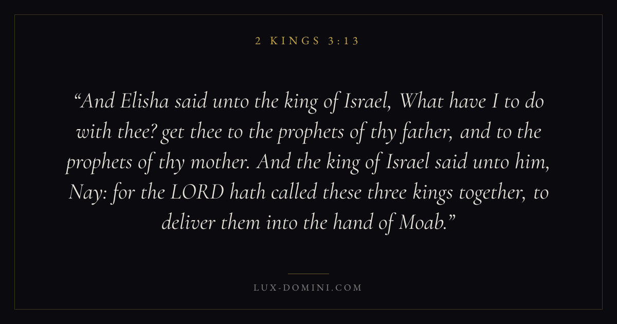 And Elisha said unto the king of Israel, What have I to do with thee? get thee to the prophets of thy father, and to the prophets of thy mother. And the king of Israel said unto him, Nay: for the LORD hath called these three kings together, to deliver them into the hand of Moab.