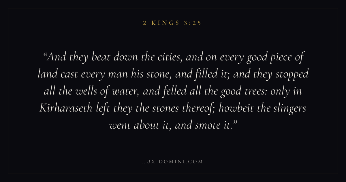 And they beat down the cities, and on every good piece of land cast every man his stone, and filled it; and they stopped all the wells of water, and felled all the good trees: only in Kirharaseth left they the stones thereof; howbeit the slingers went about it, and smote it.