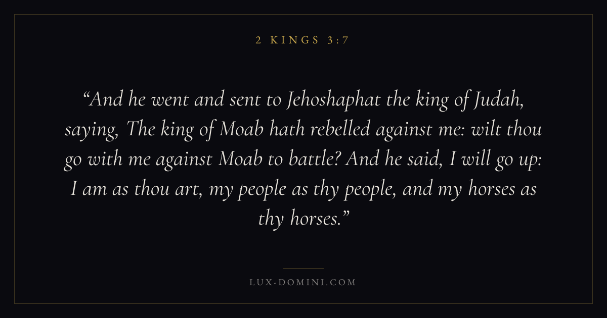 And he went and sent to Jehoshaphat the king of Judah, saying, The king of Moab hath rebelled against me: wilt thou go with me against Moab to battle? And he said, I will go up: I am as thou art, my people as thy people, and my horses as thy horses.