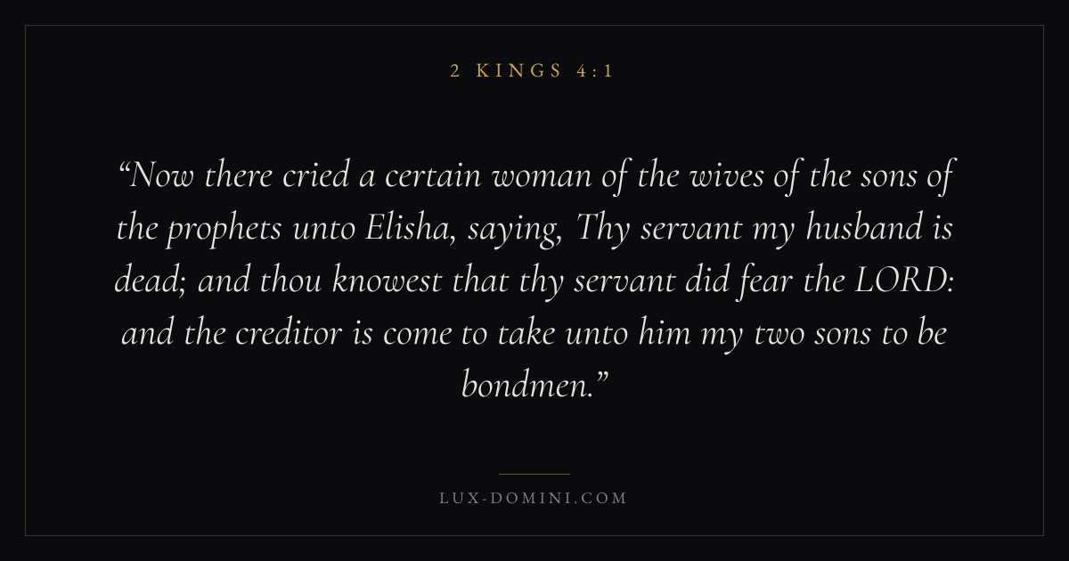 Now there cried a certain woman of the wives of the sons of the prophets unto Elisha, saying, Thy servant my husband is dead; and thou knowest that thy servant did fear the LORD: and the creditor is come to take unto him my two sons to be bondmen.