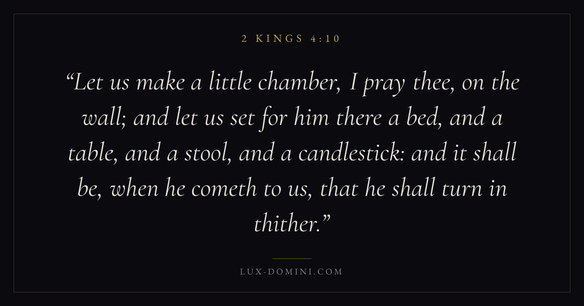 Let us make a little chamber, I pray thee, on the wall; and let us set for him there a bed, and a table, and a stool, and a candlestick: and it shall be, when he cometh to us, that he shall turn in thither.