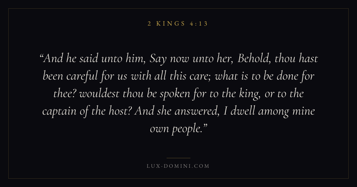 And he said unto him, Say now unto her, Behold, thou hast been careful for us with all this care; what is to be done for thee? wouldest thou be spoken for to the king, or to the captain of the host? And she answered, I dwell among mine own people.