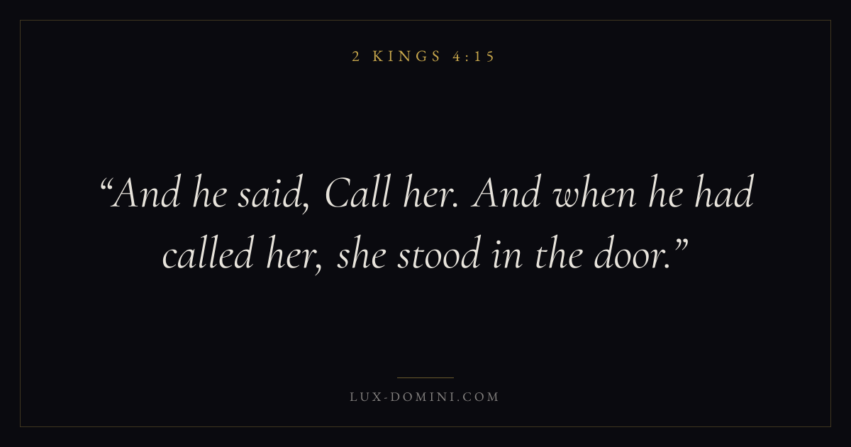 Books / 2 Kings / Chapter 4 / Verse 15 ← 2 Kings 4:14 2 Kings 4:15 2 Kings 4:16 → And he said, Call her. And when he had called her, she stood in the door. Download verse card Share on Twitter Share on Facebook Pin it ✦ Key themes HopeJustice and mercyTruthProphetic witness Read with 2 Kings 4:162 Kings 4:17Romans 8:24Revelation 21:4 Related topics Bible verses about hopeBible verses about justice and mercyBible verses about truth ✦ 2 Kings Chapter 4 verses V. 1 V. 2 V. 3 V. 4 V. 5 V. 6 V. 7 V. 8 V. 9 V. 10 V. 11 V. 12 V. 13 V. 14 V. 15 V. 16 V. 17 V. 18 V. 19 V. 20 V. 21 V. 22 V. 23 V. 24 V. 25 V. 26 V. 27 V. 28 V. 29 V. 30 V. 31 V. 32 V. 33 V. 34 V. 35 V. 36 V. 37 V. 38 V. 39 V. 40 V. 41 V. 42 V. 43 V. 44