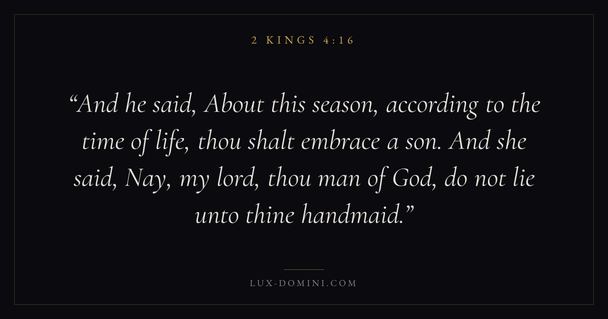 And he said, About this season, according to the time of life, thou shalt embrace a son. And she said, Nay, my lord, thou man of God, do not lie unto thine handmaid.