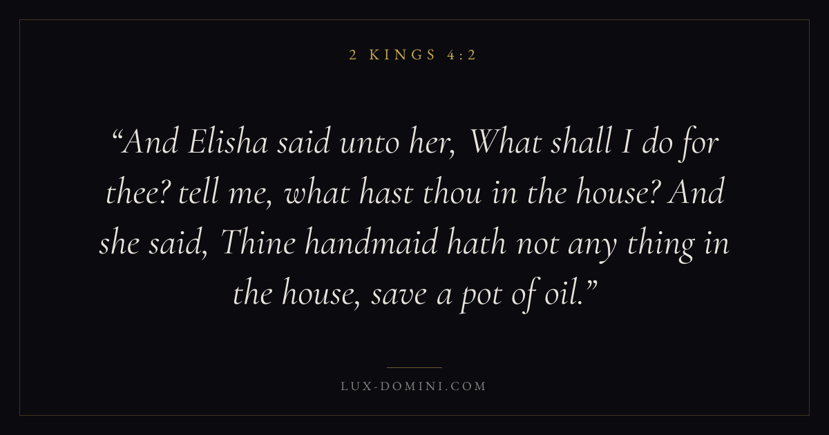 And Elisha said unto her, What shall I do for thee? tell me, what hast thou in the house? And she said, Thine handmaid hath not any thing in the house, save a pot of oil.