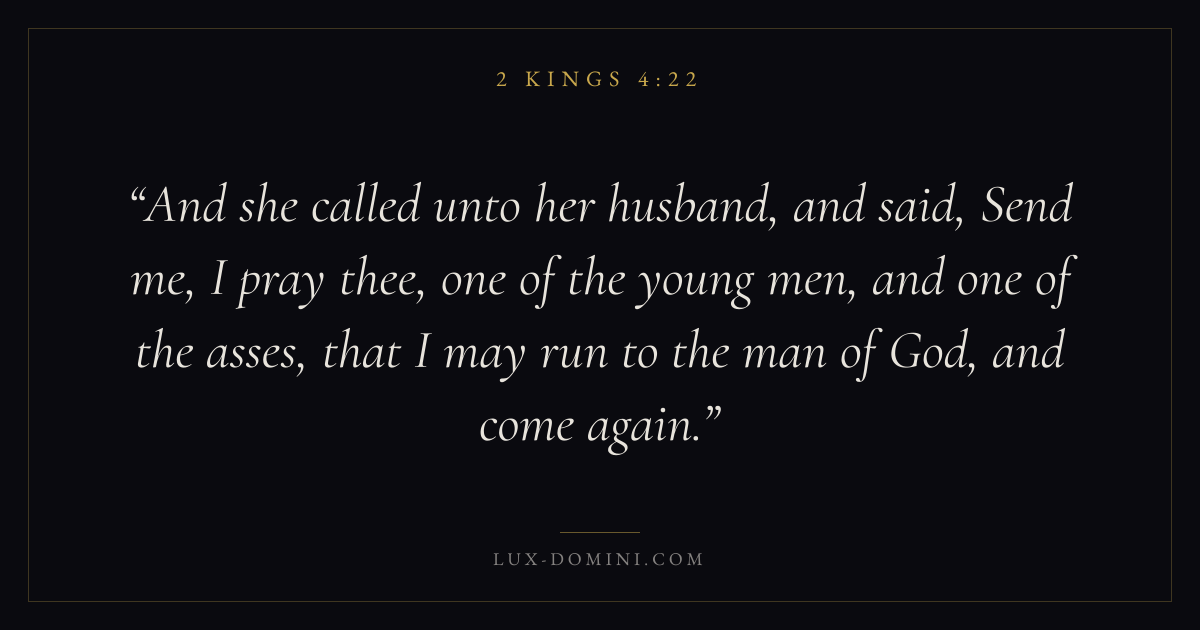 And she called unto her husband, and said, Send me, I pray thee, one of the young men, and one of the asses, that I may run to the man of God, and come again.