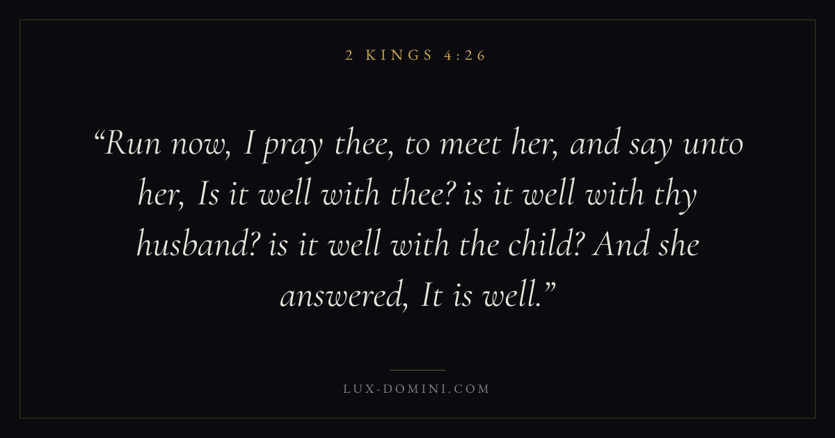 Run now, I pray thee, to meet her, and say unto her, Is it well with thee? is it well with thy husband? is it well with the child? And she answered, It is well.