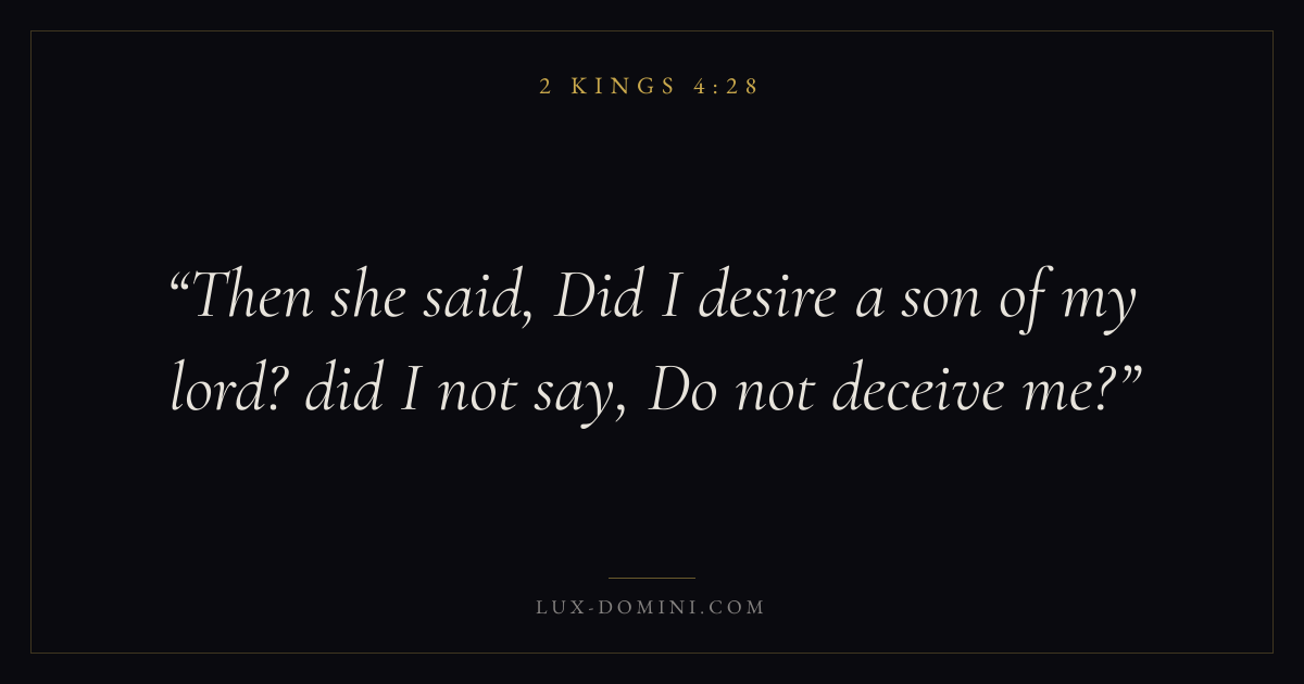 Books / 2 Kings / Chapter 4 / Verse 28 ← 2 Kings 4:27 2 Kings 4:28 2 Kings 4:29 → Then she said, Did I desire a son of my lord? did I not say, Do not deceive me? Download verse card Share on Twitter Share on Facebook Pin it ✦ Key themes LoveHopePrayerJustice and mercyProphetic witness Read with 2 Kings 4:292 Kings 4:30John 3:161 Corinthians 13:4 Related topics Bible verses about loveBible verses about hopeBible verses about prayerBible verses about justice and mercy ✦ 2 Kings Chapter 4 verses V. 1 V. 2 V. 3 V. 4 V. 5 V. 6 V. 7 V. 8 V. 9 V. 10 V. 11 V. 12 V. 13 V. 14 V. 15 V. 16 V. 17 V. 18 V. 19 V. 20 V. 21 V. 22 V. 23 V. 24 V. 25 V. 26 V. 27 V. 28 V. 29 V. 30 V. 31 V. 32 V. 33 V. 34 V. 35 V. 36 V. 37 V. 38 V. 39 V. 40 V. 41 V. 42 V. 43 V. 44