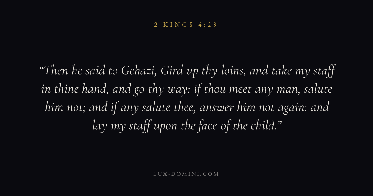 Then he said to Gehazi, Gird up thy loins, and take my staff in thine hand, and go thy way: if thou meet any man, salute him not; and if any salute thee, answer him not again: and lay my staff upon the face of the child.