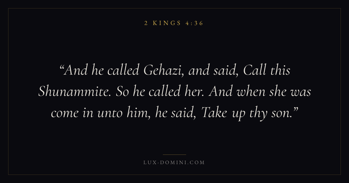 And he called Gehazi, and said, Call this Shunammite. So he called her. And when she was come in unto him, he said, Take up thy son.