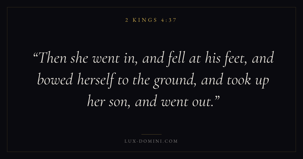 Then she went in, and fell at his feet, and bowed herself to the ground, and took up her son, and went out.