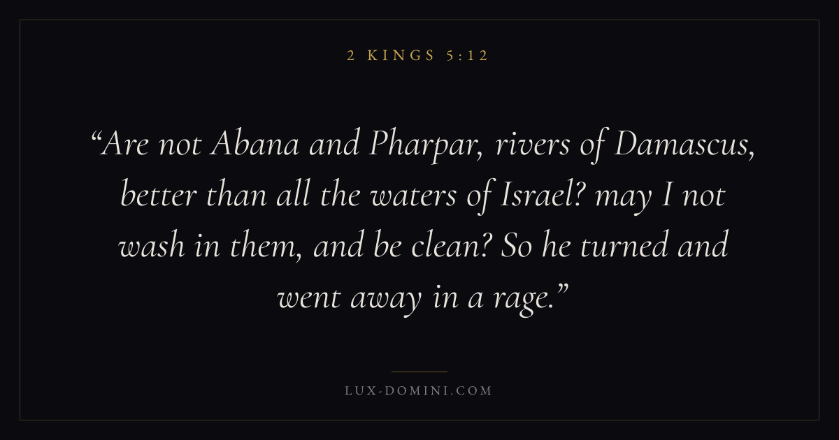 Are not Abana and Pharpar, rivers of Damascus, better than all the waters of Israel? may I not wash in them, and be clean? So he turned and went away in a rage.
