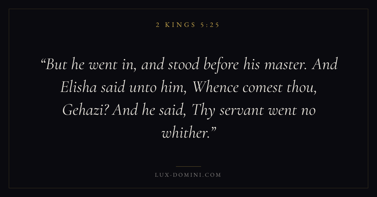 But he went in, and stood before his master. And Elisha said unto him, Whence comest thou, Gehazi? And he said, Thy servant went no whither.