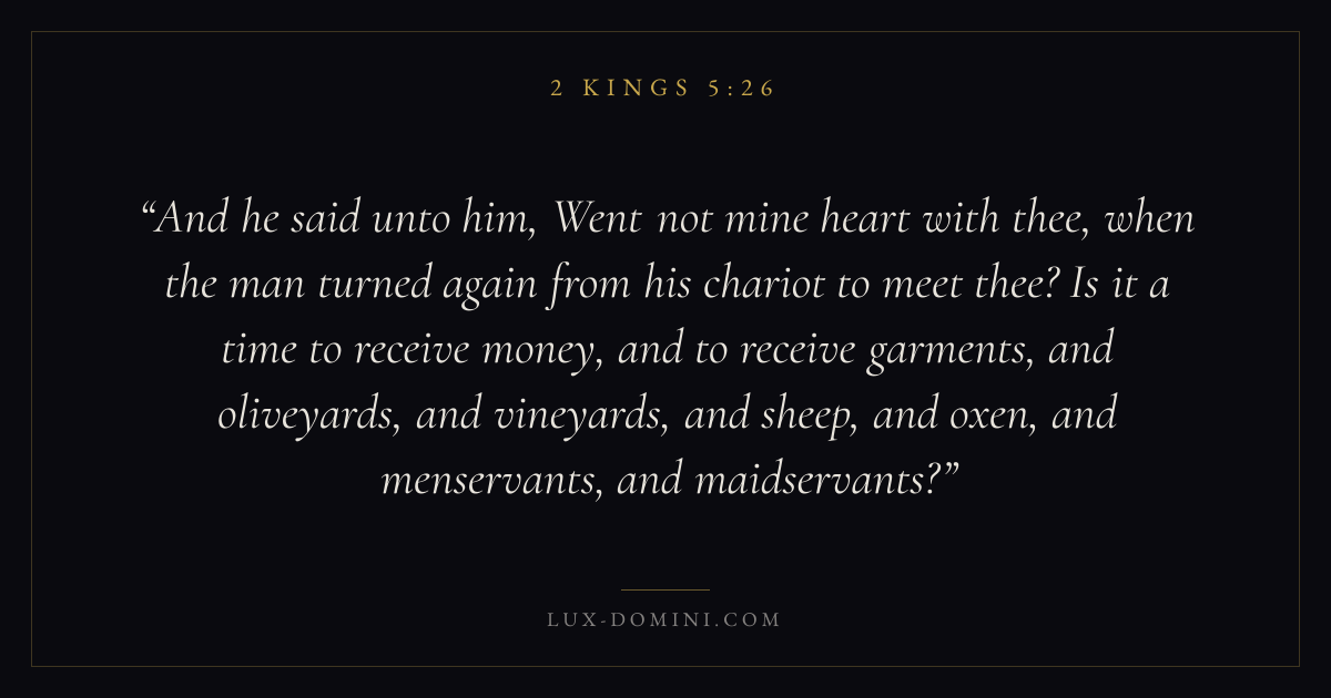 And he said unto him, Went not mine heart with thee, when the man turned again from his chariot to meet thee? Is it a time to receive money, and to receive garments, and oliveyards, and vineyards, and sheep, and oxen, and menservants, and maidservants?