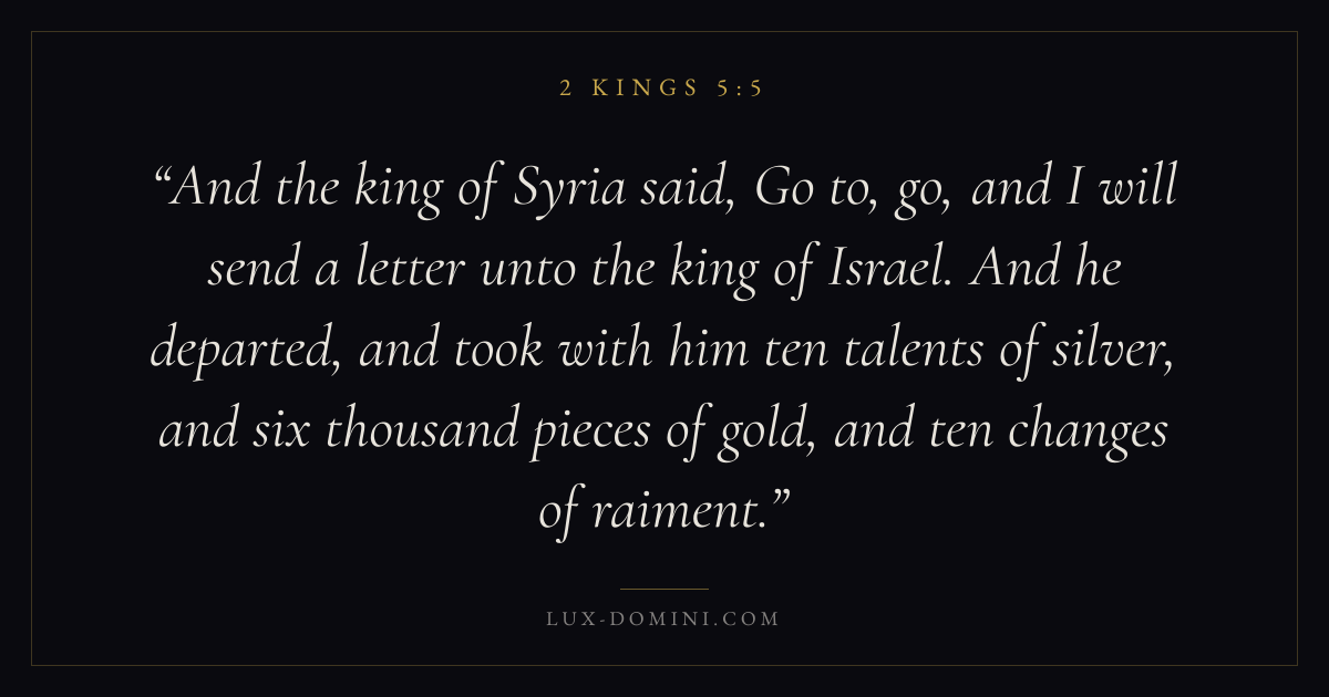 And the king of Syria said, Go to, go, and I will send a letter unto the king of Israel. And he departed, and took with him ten talents of silver, and six thousand pieces of gold, and ten changes of raiment.