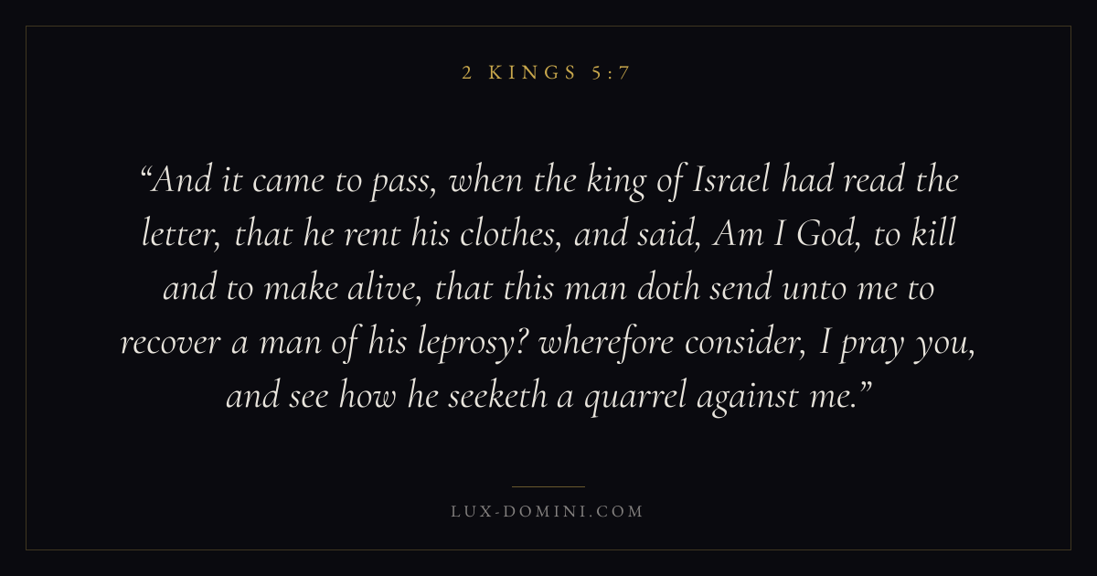And it came to pass, when the king of Israel had read the letter, that he rent his clothes, and said, Am I God, to kill and to make alive, that this man doth send unto me to recover a man of his leprosy? wherefore consider, I pray you, and see how he seeketh a quarrel against me.