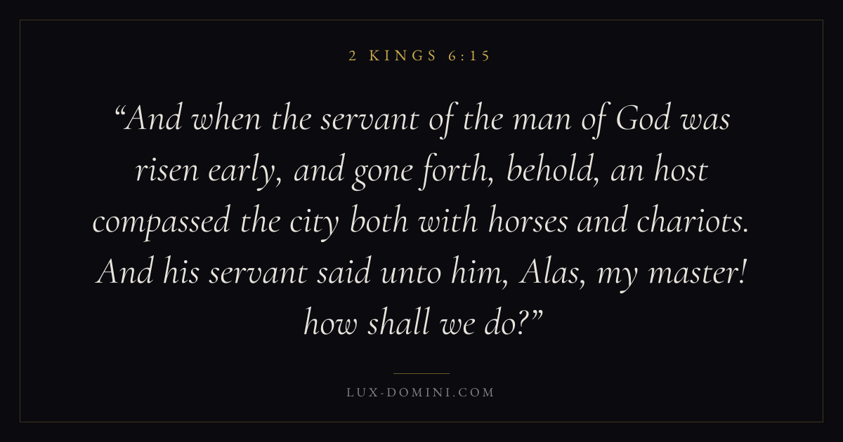 And when the servant of the man of God was risen early, and gone forth, behold, an host compassed the city both with horses and chariots. And his servant said unto him, Alas, my master! how shall we do?