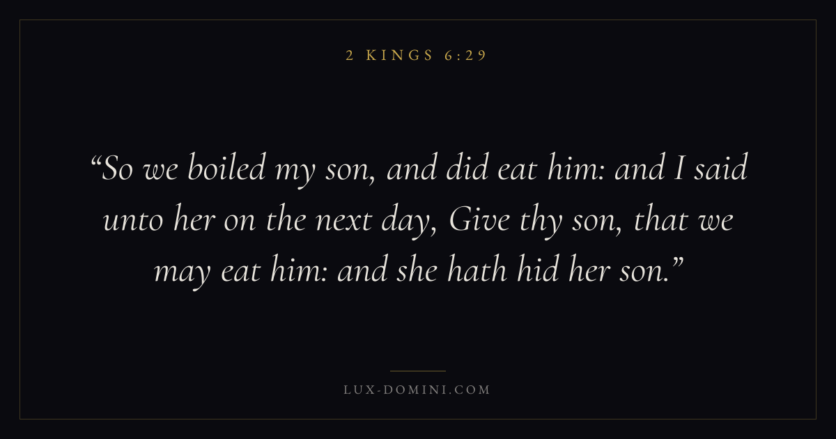 So we boiled my son, and did eat him: and I said unto her on the next day, Give thy son, that we may eat him: and she hath hid her son.