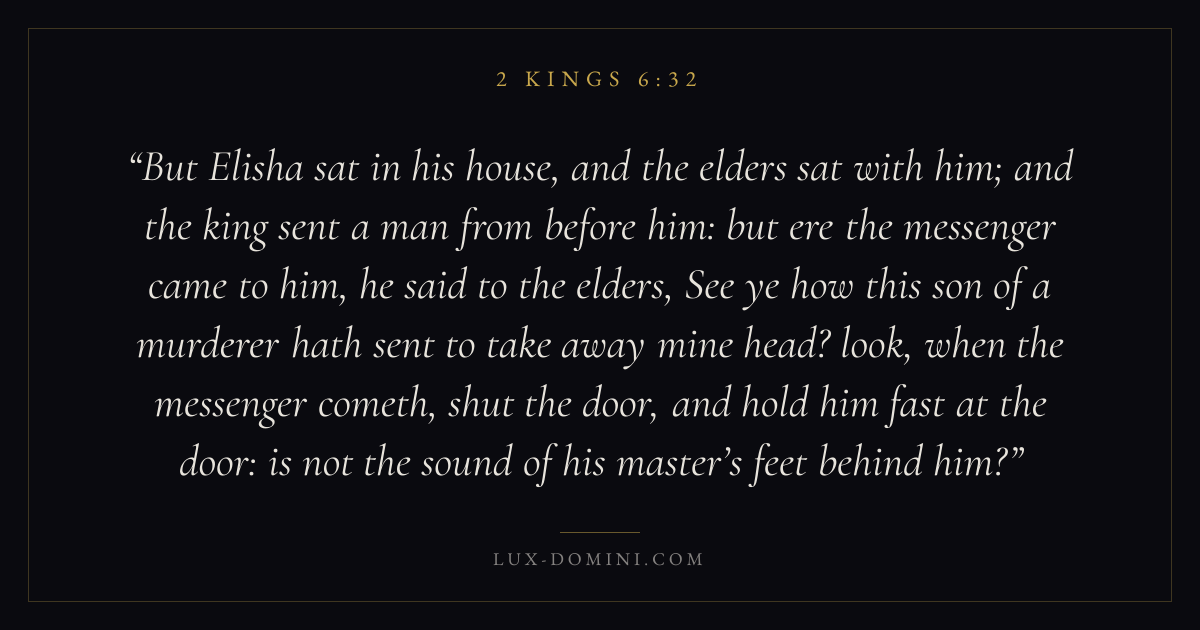 But Elisha sat in his house, and the elders sat with him; and the king sent a man from before him: but ere the messenger came to him, he said to the elders, See ye how this son of a murderer hath sent to take away mine head? look, when the messenger cometh, shut the door, and hold him fast at the door: is not the sound of his master’s feet behind him?