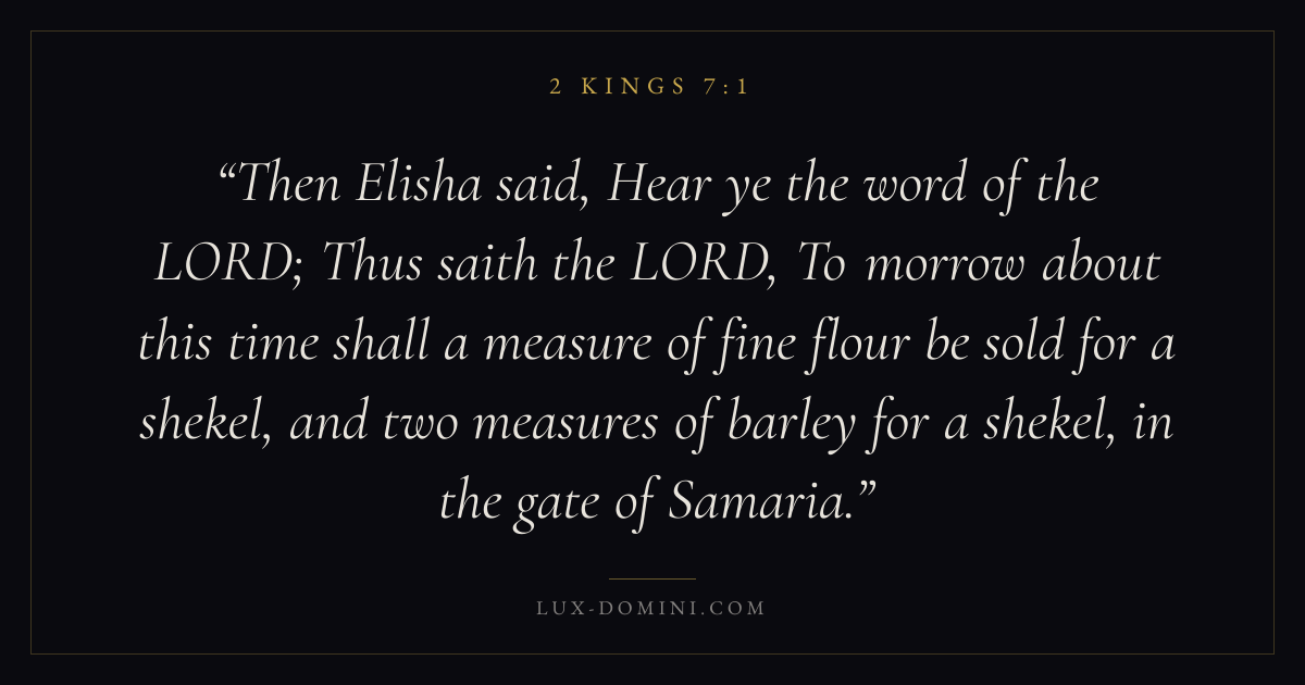 Then Elisha said, Hear ye the word of the LORD; Thus saith the LORD, To morrow about this time shall a measure of fine flour be sold for a shekel, and two measures of barley for a shekel, in the gate of Samaria.