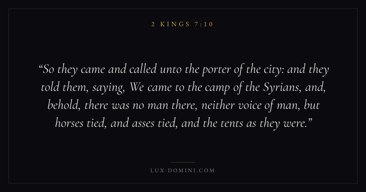 So they came and called unto the porter of the city: and they told them, saying, We came to the camp of the Syrians, and, behold, there was no man there, neither voice of man, but horses tied, and asses tied, and the tents as they were.