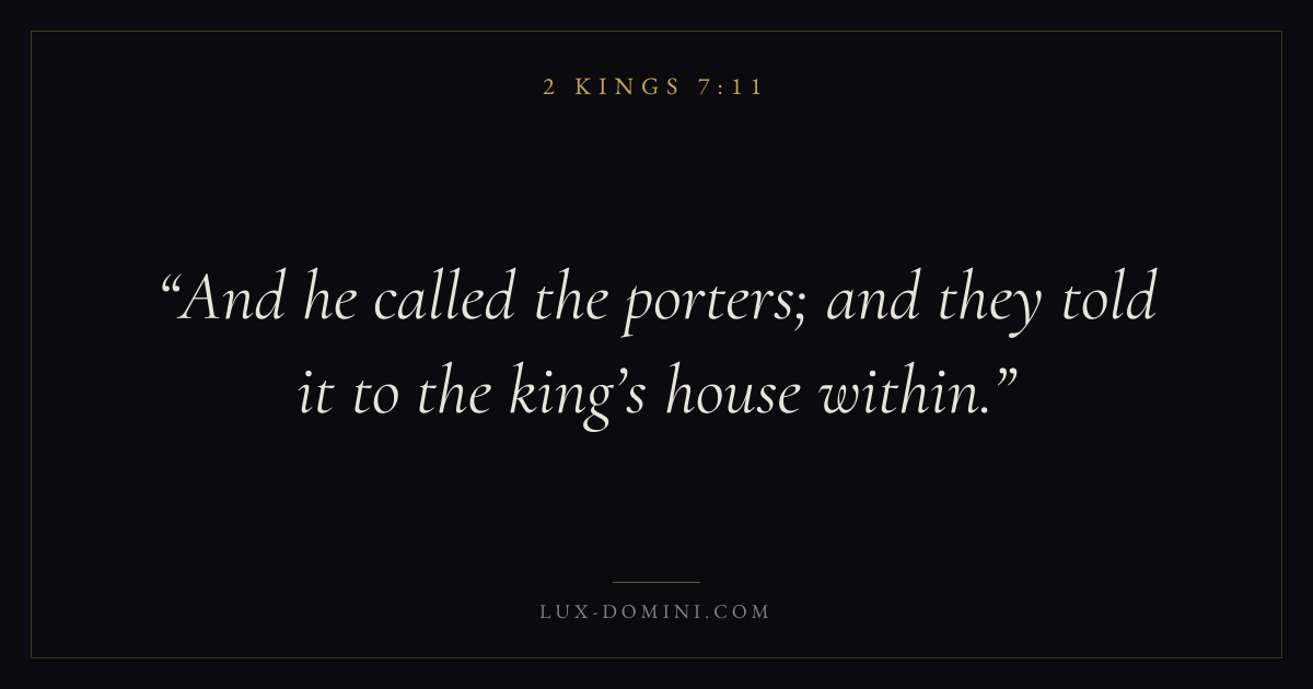 Books / 2 Kings / Chapter 7 / Verse 11 ← 2 Kings 7:10 2 Kings 7:11 2 Kings 7:12 → And he called the porters; and they told it to the king’s house within. Download verse card Share on Twitter Share on Facebook Pin it ✦ Key themes HopeAnxiety and fearJustice and mercyTruthProphetic witness Read with 2 Kings 7:92 Kings 7:10Romans 8:24Revelation 21:4 Related topics Bible verses about hopeBible verses about anxiety and fearBible verses about justice and mercyBible verses about truth ✦ 2 Kings Chapter 7 verses V. 1 V. 2 V. 3 V. 4 V. 5 V. 6 V. 7 V. 8 V. 9 V. 10 V. 11 V. 12 V. 13 V. 14 V. 15 V. 16 V. 17 V. 18 V. 19 V. 20