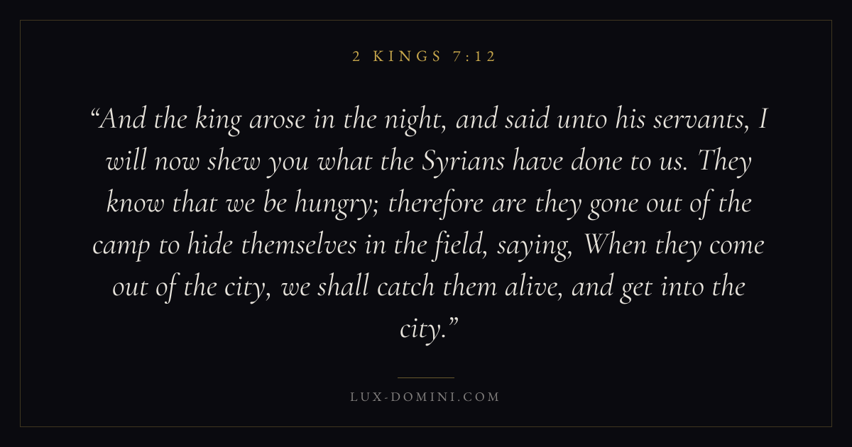And the king arose in the night, and said unto his servants, I will now shew you what the Syrians have done to us. They know that we be hungry; therefore are they gone out of the camp to hide themselves in the field, saying, When they come out of the city, we shall catch them alive, and get into the city.