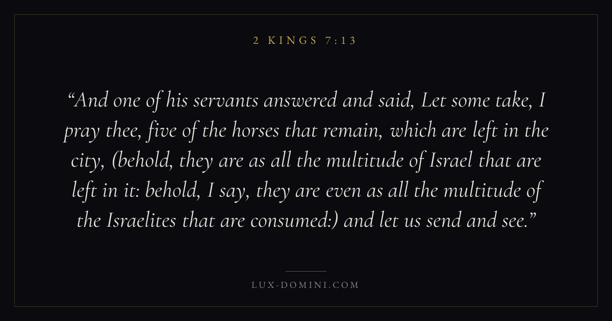 And one of his servants answered and said, Let some take, I pray thee, five of the horses that remain, which are left in the city, (behold, they are as all the multitude of Israel that are left in it: behold, I say, they are even as all the multitude of the Israelites that are consumed:) and let us send and see.