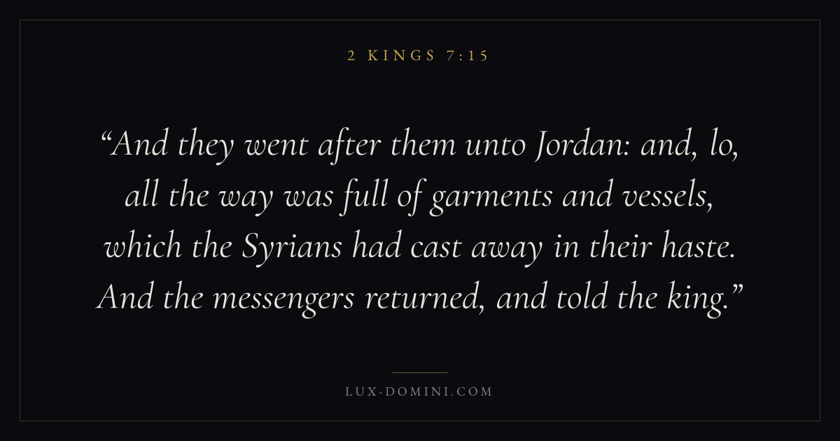 And they went after them unto Jordan: and, lo, all the way was full of garments and vessels, which the Syrians had cast away in their haste. And the messengers returned, and told the king.