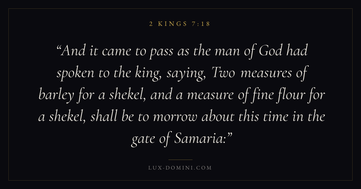 And it came to pass as the man of God had spoken to the king, saying, Two measures of barley for a shekel, and a measure of fine flour for a shekel, shall be to morrow about this time in the gate of Samaria: