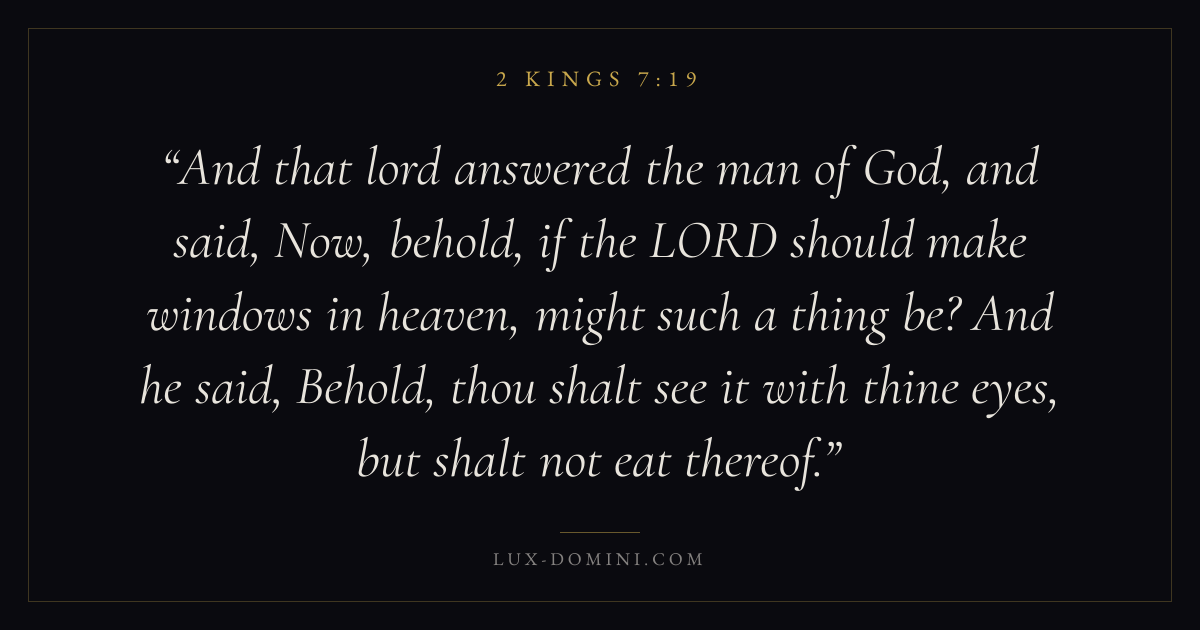 And that lord answered the man of God, and said, Now, behold, if the LORD should make windows in heaven, might such a thing be? And he said, Behold, thou shalt see it with thine eyes, but shalt not eat thereof.