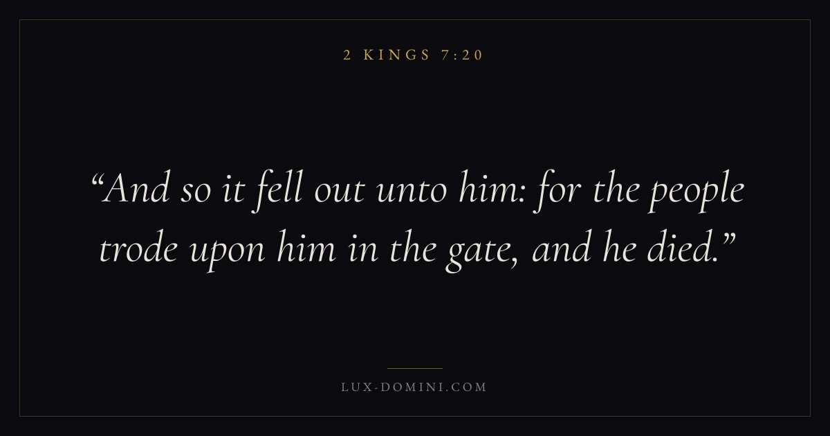 Books / 2 Kings / Chapter 7 / Verse 20 ← 2 Kings 7:19 2 Kings 7:20 2 Kings 8:1 → And so it fell out unto him: for the people trode upon him in the gate, and he died. Download verse card Share on Twitter Share on Facebook Pin it ✦ Key themes HopeJustice and mercyTruthProphetic witness Read with 2 Kings 7:172 Kings 7:18Romans 8:24Revelation 21:4 Related topics Bible verses about hopeBible verses about justice and mercyBible verses about truth ✦ 2 Kings Chapter 7 verses V. 1 V. 2 V. 3 V. 4 V. 5 V. 6 V. 7 V. 8 V. 9 V. 10 V. 11 V. 12 V. 13 V. 14 V. 15 V. 16 V. 17 V. 18 V. 19 V. 20