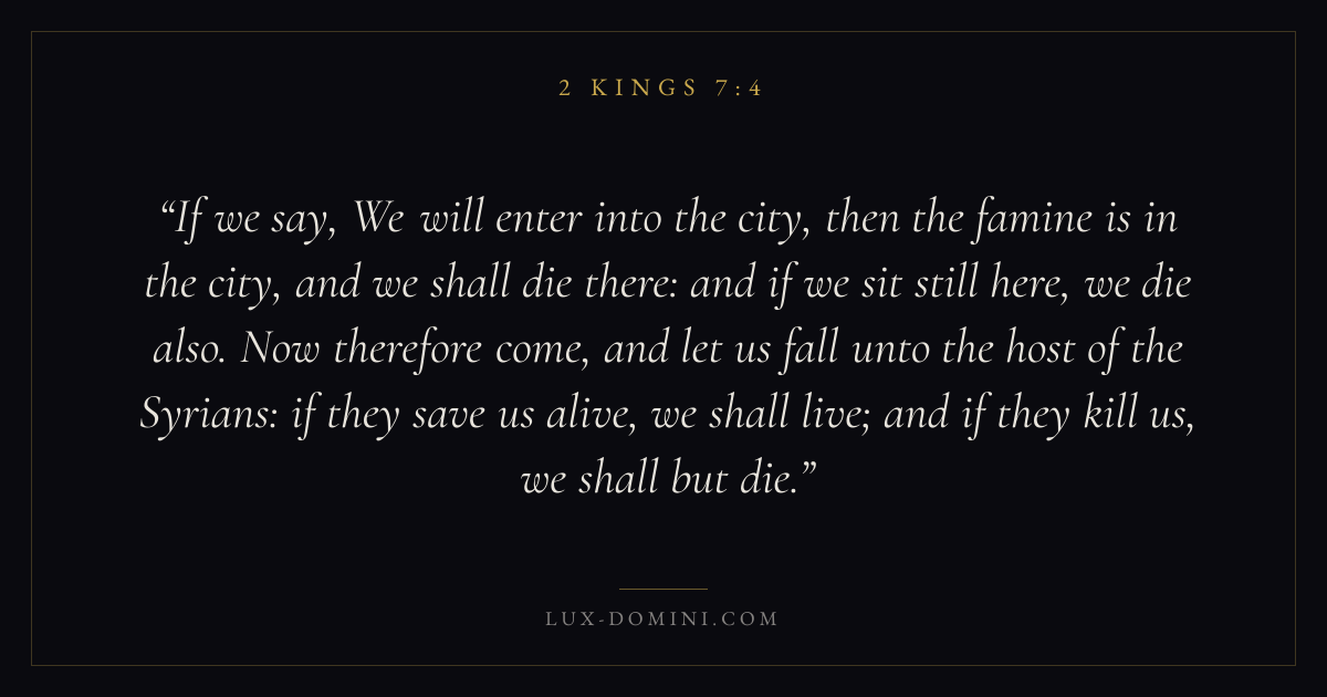 If we say, We will enter into the city, then the famine is in the city, and we shall die there: and if we sit still here, we die also. Now therefore come, and let us fall unto the host of the Syrians: if they save us alive, we shall live; and if they kill us, we shall but die.