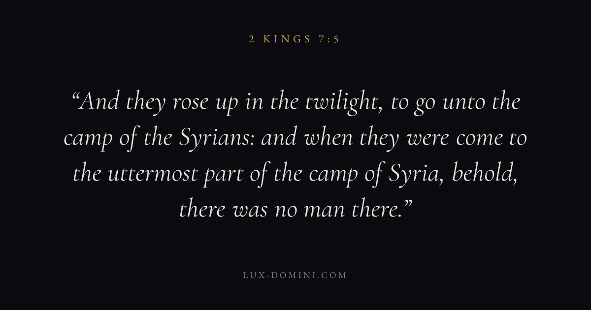 And they rose up in the twilight, to go unto the camp of the Syrians: and when they were come to the uttermost part of the camp of Syria, behold, there was no man there.